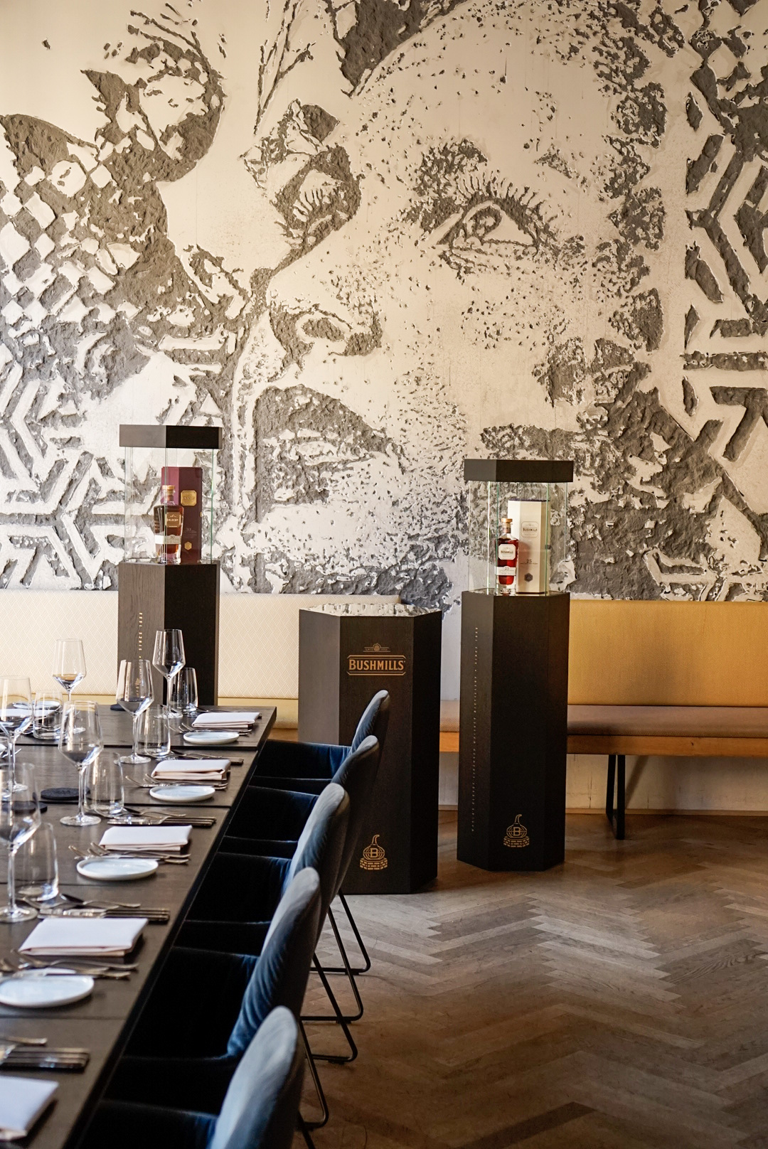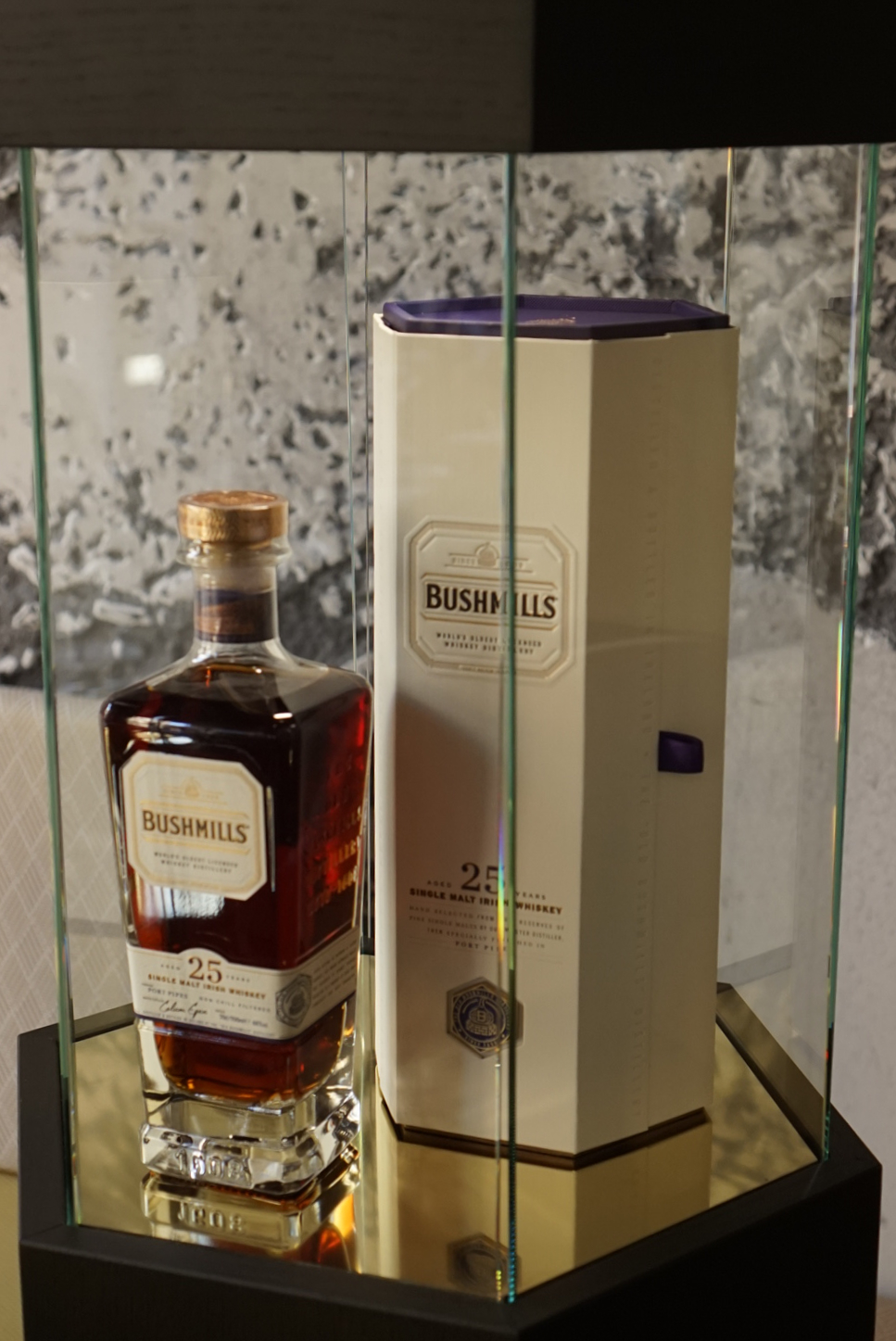 The display cabinets for Bushmills Whiskey combine traditional craftsmanship with contemporary design. Constructed from stained oak and topped with a clear glass topper, they create an elegant frame that showcases the valuable product with impact.